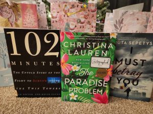 Hello fellow readers and welcome to the first day in my countdown to the best books of 2024. Kicking off our list are three honorable mentions that didn’t quite meet the cut but are still worth the read nonetheless. They are The Paradise Problem by Christina Lauren, 102 Minutes: The Untold Story of the Fight to Survive Inside the Twin Towers by Jim Dwyer and Kevin Flynn, and I Must Betray You by Ruta Sepetys.